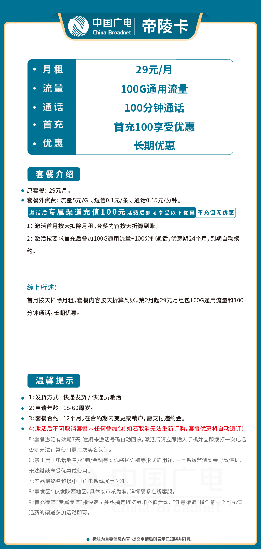 此卡禁止用于电话销售/推销/金融等类似骚扰诈骗或频繁通话形式的用途,一旦系统监测到会导致停机,无法继续享受优惠或使用。严重者将承担相关法律责任!激活时请务必了解《产品使用说明》。